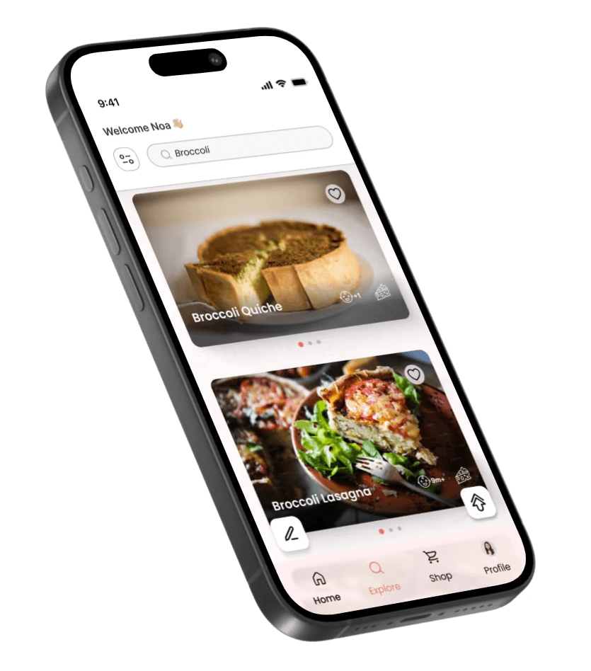 This screen showcases the option to save recipes. When tapping the heart icon, an animation plays where the heart drops into the profile icon in the bottom menu – visually confirming the save action in a pleasant way.