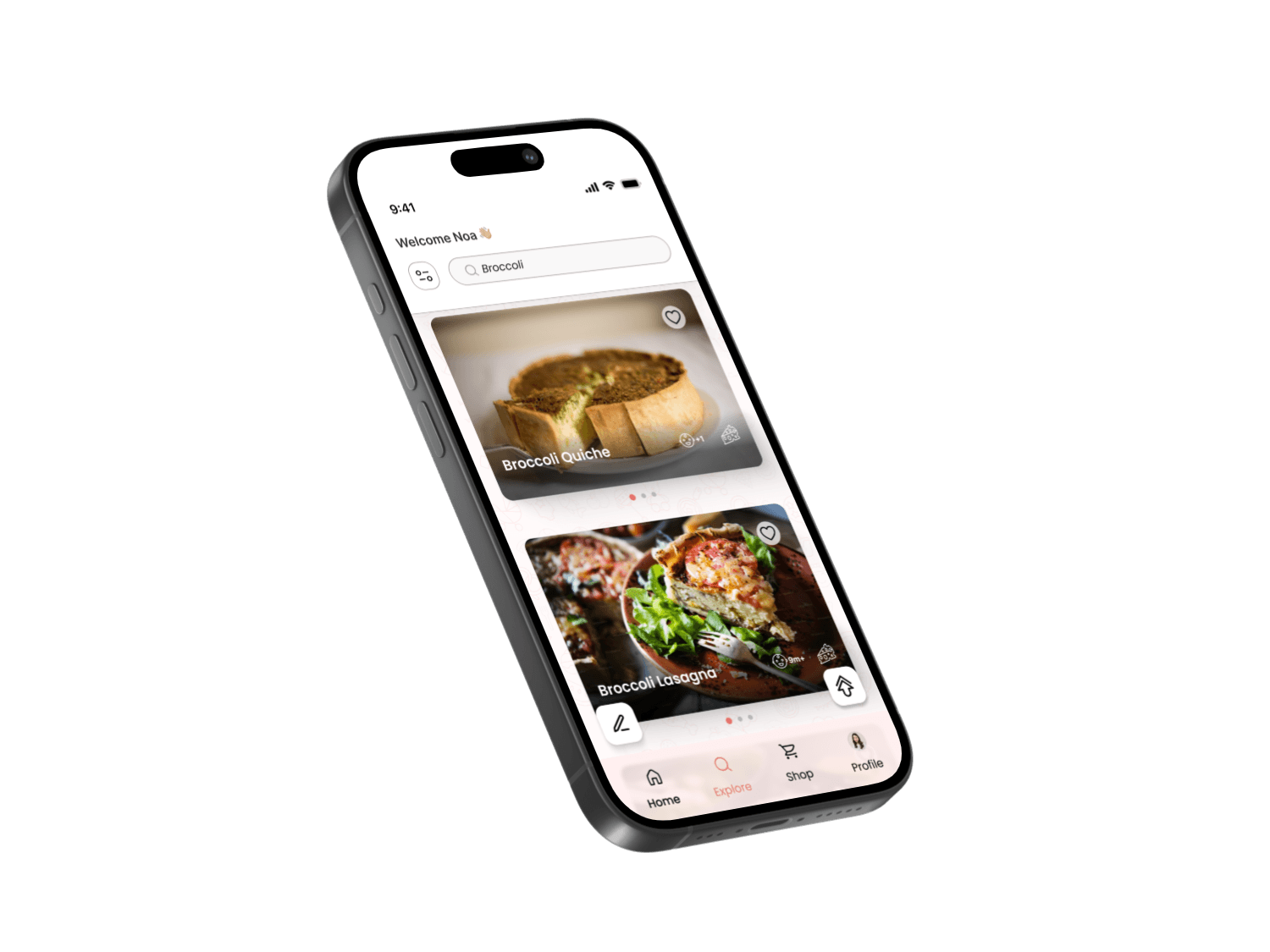 This section introduces the core screens of the app, highlighting its concept, key features, and user experience designed for busy parents looking for simple and practical solutions. The selected screens reflect the essence of the app - personalized recipes, easy saving and searching, and one-click actions.