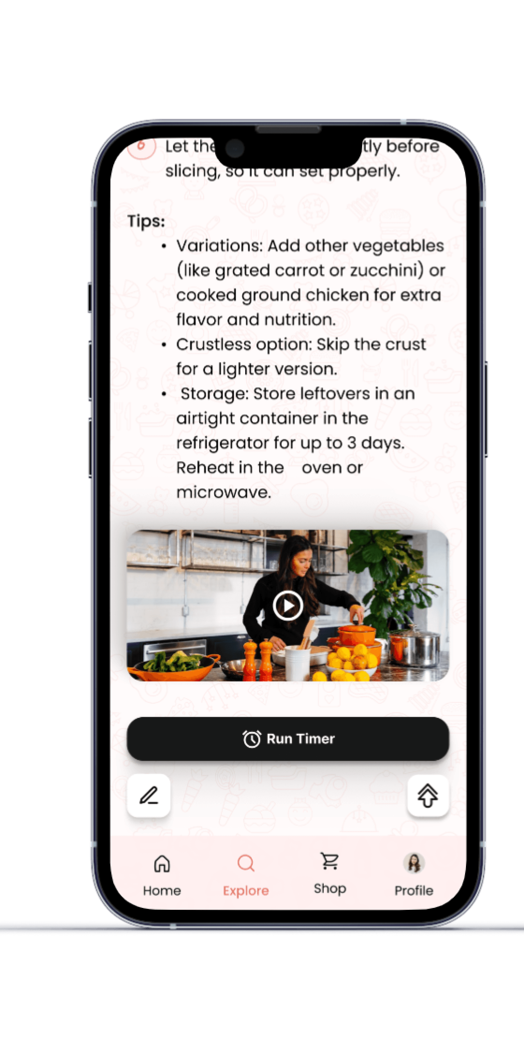the bottom of the screen, a built-in timer button allows users to start cooking without having to switch to an external clock app, keeping the entire experience within the app.